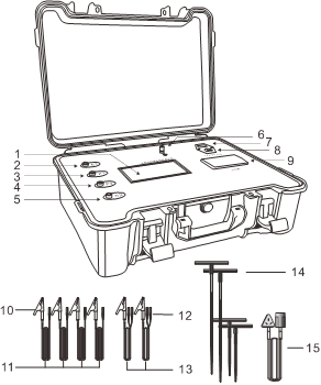 標準測試線長 | 紅色15m,黑色15m,黃色10m,綠色10m,黃色1.5m,綠色1.5m各1條 | ||